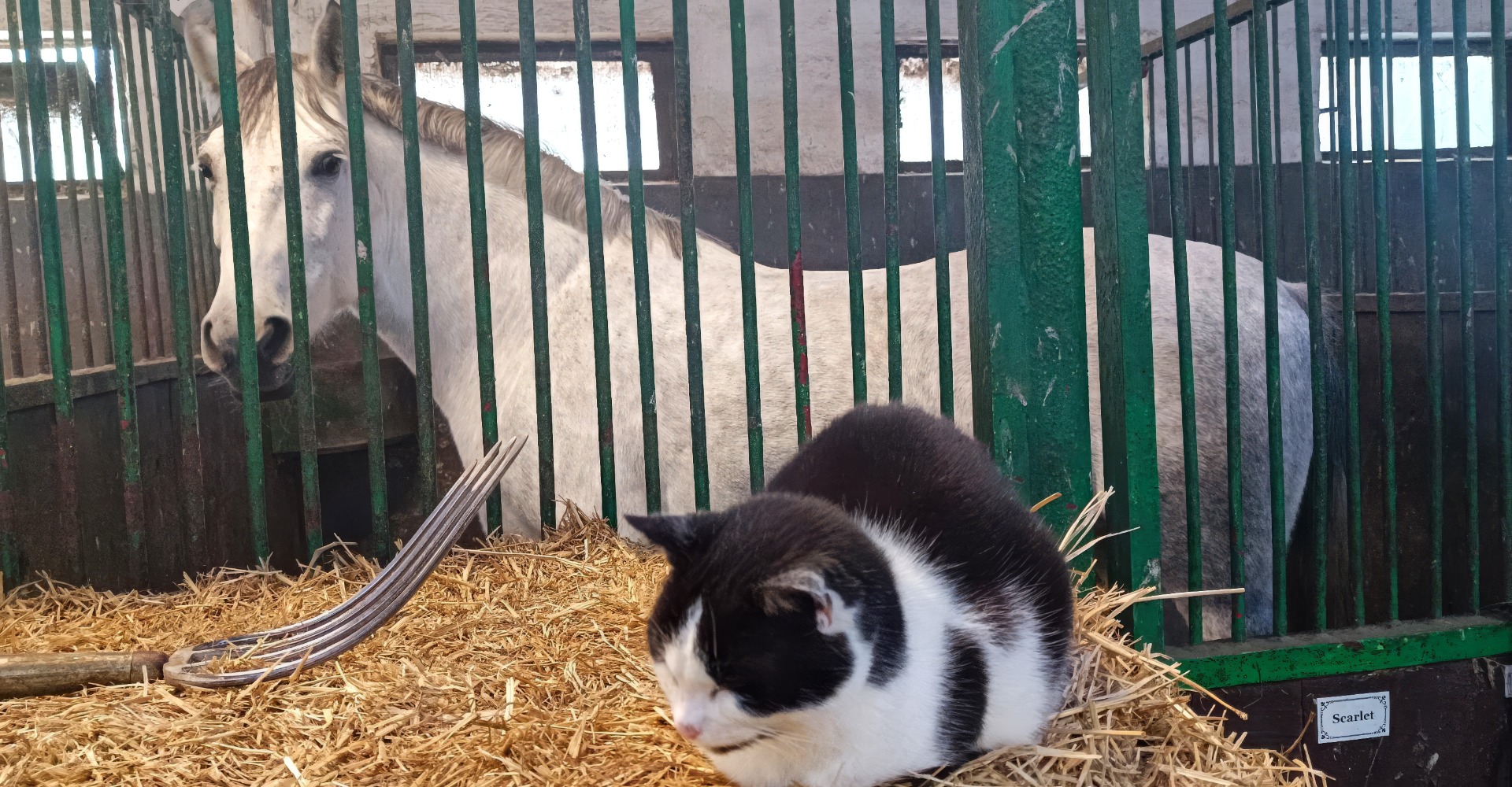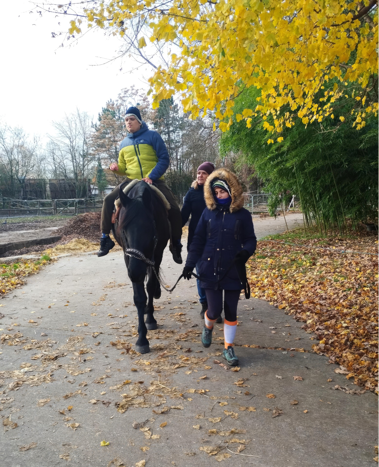 My s Monikou kráčame po boku, aby sme mu pridržiavali nohy, aby nimi náhodou nepopchol koňa do klusu. Takisto musíme dávať pozor, aby sa nezošmykol. Inak je všetko v poriadku a Miško si jazdu užíva.